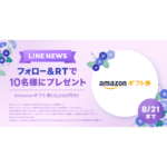 2022.08.18 Twitter 🌈Amazonギフト券1万円分が当たる🎫Twitterのフォロー&リツイートキャンペーン🌈 kensho_admin 当たるもの Amazonギフト券:1万円分 当選人数 10名 応募方法 1)LINE NEWS公式Twitterアカウント(@news_line_me)をフォロー 2)この投稿をRT(8/21 24時まで) ※当選後、当選者にDMを送ります 応募締め切り 2022/08/21 応募はこちらから #2022年8月締切#Amazonギフト券